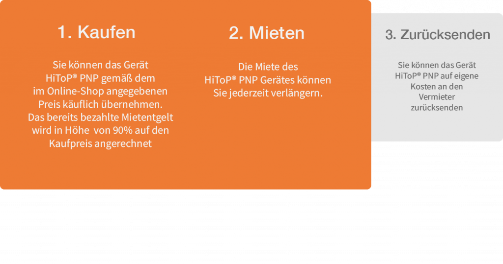 Die meisten Patienten nutzen das HiToP® PNP täglich eine Stunde. Dabei brauchen Sie keinen Arzt, keinen Physiotherapeuten und keine Pfleger: Sie können das HiToP® PNP ganz einfach selbst anlegen. Nutzen Sie Ihre persönlichen Auszeiten mit dem HiToP® PNP. Sie können dabei Fernsehen, Lesen, Musik hören oder einfach nur Ausruhen. Wir empfehlen, dass Sie sich dabei entspannt zurücklehnen und einfach genießen. Die meisten Patienten berichten uns, dass sie sich anschließend entspannt und vitalisiert fühlen. Bei der  3-Monatsmiete erhalten Sie zusätzlich telefonisch wertvolle Unterstützung von unserem Expertenteam. Dazu gehören neben grundsätzlichen Informationen rund um die Polyneuropathie und die Hochtontherapie wichtige Hinweise zum Anlegen des Gerätes damit  Sie Ihr optimales Ergebnis erzielen!